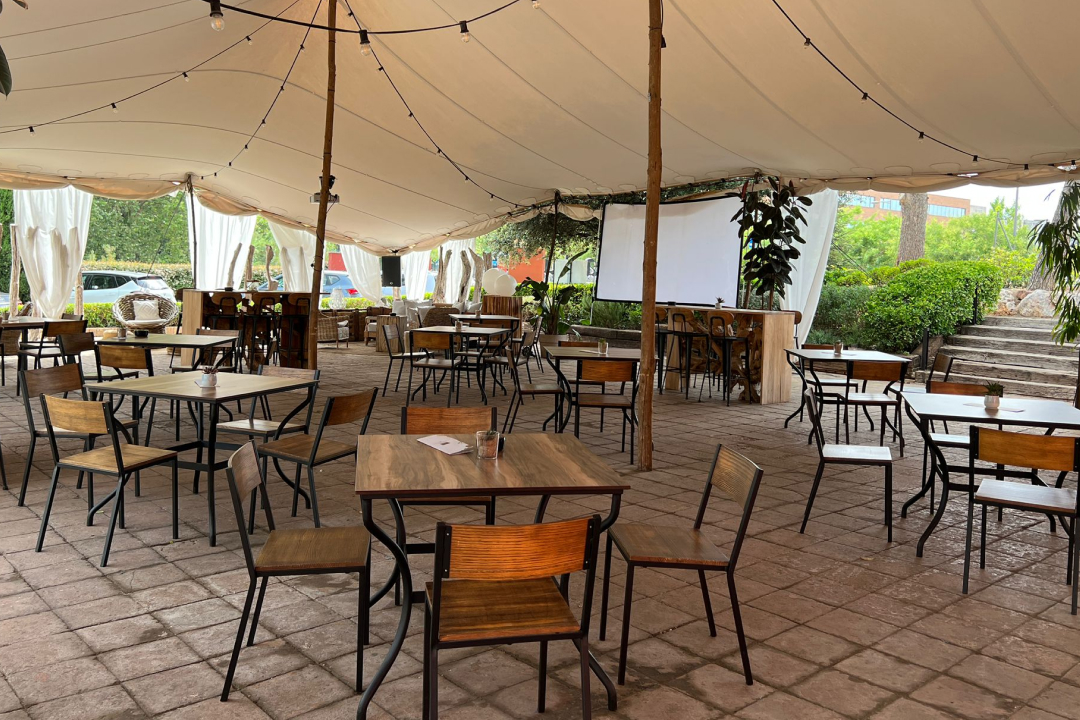 Justo en la entrada, envuelta por una bonita carpa se encuentra este espacio ideal para comer, compartir unas tapas o tomarse un cóctel. La versatilidad de la carpa se adapta perfectamente a la época del año: cerrada y caliente en invierno, abierta y sombreada en verano. Relájate junto a tus seres queridos en sus sofás al estilo chill-out, acompañados de buena música.