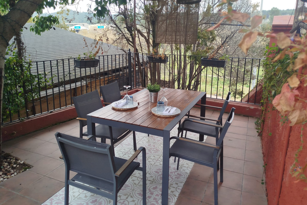 Un rincón exterior mágico y muy acogedor con unas preciosas vistas a la montaña de Collserola. Ideal para una comida o cena íntima en primavera o verano.
